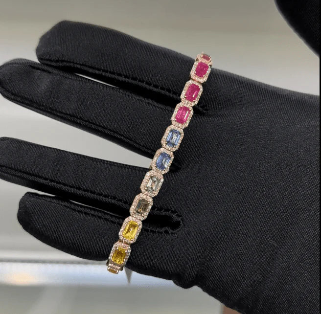 Embrace the dazzling glamour of our Emerald Sapphire & Diamond Halo Bracelet. The generous 6mm x 4mm sapphires are encircled by a dazzling halo of sparkling round brilliant cut diamonds, all set in your choice of metal. With a stunning 14.0ct sapphire (Natural) weight and 4.98ct diamond weight, this is a must-have gem for any collector.